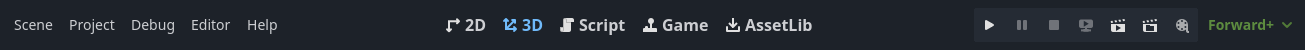 Editörün üst kısmında 5 ana ekran butonu bulunur: 2D, 3D, Script, Game ve Asset Library.