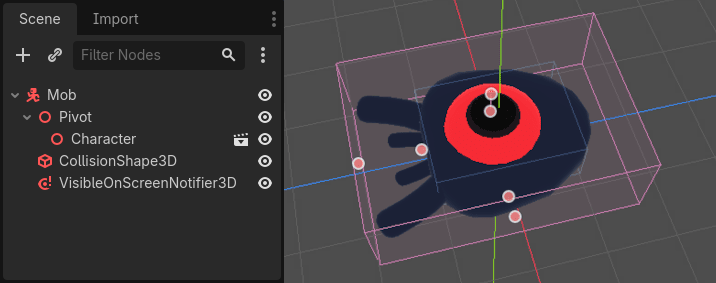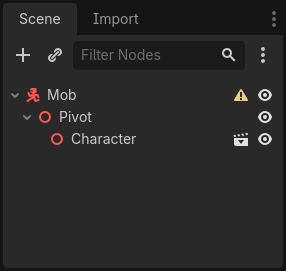 art/klasörü)mob.glbdosyasınıPivotnode’unun üzerine sürükleyerek 3D modeli sahnenize ekleyin. Oluşan node’un adınıCharacterolarak değiştirebilirsiniz.