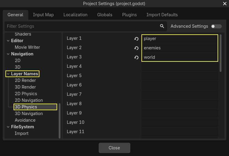 main.tscniçindeki Ground node’unu seçin. Layer olarak yalnızca 3’ü (world) işaretleyin ve Mask ayarlarının tamamını kapatın (çünkü zemin hiçbir şeyi dinlemez, sadece üstüne basılır).