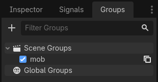 Oyuncunun düşmanı ezdiğini algılaması için öncelikle düşmanları bir grup altında toplamalıyız. mob.tscn sahnesini açın, kök Mob node’unu seçip sağdaki Groups sekmesinden mob adında yeni bir grup oluşturarak node’u bu gruba dâhil edin.