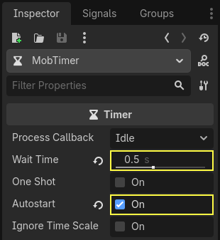 Mainnode’una bir Timer ekleyin ve adınıMobTimeryapın. - Inspector panelinden Wait Time (Bekleme Süresi) değerini