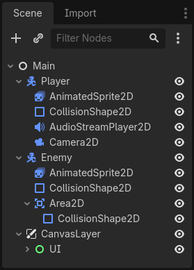 Node’ları bir ağaç yapısında düzenlediğinizde — tıpkı yukarıdaki karakter örneğinde olduğu gibi — buna sahne (scene) denir.