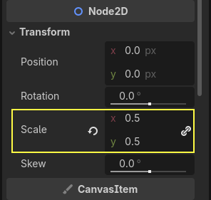 Node2Daltındaki Scale değerini(0.5, 0.5)yaparak karakteri yarı yarıya küçültün.