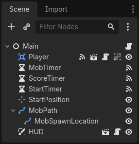 Mainsahnesine iki adetAudioStreamPlayernode’u ekleyip isimleriniMusicveDeathSoundyapın. Oyun varlıklarındakiHouse In a Forest Loop.oggdosyasını müziğe,gameover.wavdosyasını ölüm sesine atayın.new_game()çağrıldığında müziği başlatın,game_over()çağrıldığında müziği durdurup ölüm sesini oynatın.