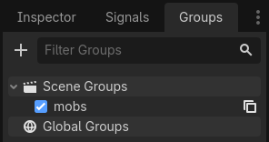 mob.tscnsahnesini açın, kök node’u seçip Groups sekmesindenmobsadında yeni bir grup oluşturup node’u bu gruba dahil edin.