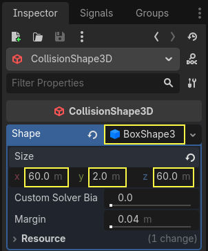 BoxShape3D boyutu 60×2×60 olarak ayarlandı