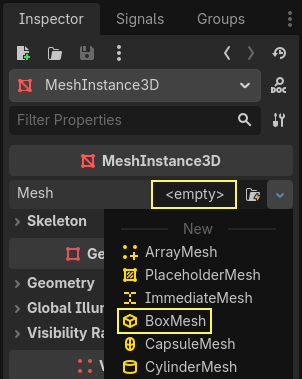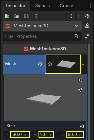 Groundnode’una birMeshInstance3Dekleyin, Mesh özelliğiniBoxMeshyapın ve onun da boyutlarını 60, 2, 60 olarak belirleyin.